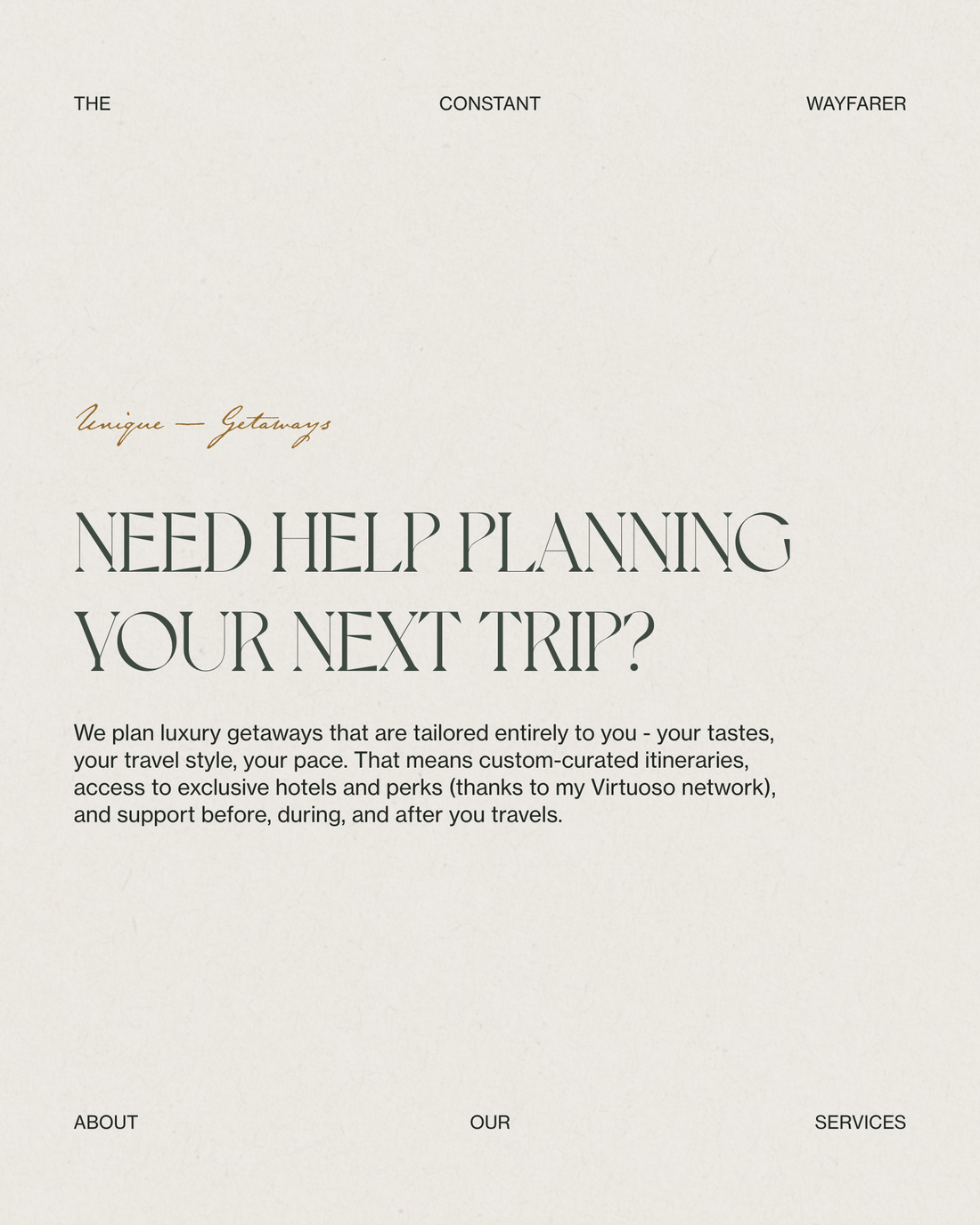 The Constant Wayfarer curate luxury getaways that are led by meaning and connection. Being so busy planning trips for clients, Ashley came to us with little time to invest in Social Media - so we took it out of her hands. Not only do they now have a consistent posting schedule, but posts are backed by strategy, designed to reach their dream clients.